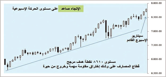 افتتح السوق على هبوط من خلاله اختبر خط الدعم 8370 نقطة دخل على إثره في منطقة حيرة، خصوصاً أنه لم ينجح في تحقيق إغلاق أعلى من مستوى 8425 نقطة من حوالي 24 جلسة، لكن تمكن نهاية الأسبوع من الإغلاق عند مستوى 8509 نقاط، وهو أعلى مستوى يصله منذ السادس من سبتمبر 2008م، حيث أنهى السوق الأسبوع بنمط شرائي قوي مدعوم بشكل واضح من المصارف وسابك ويرجح استمراره إلى 8610 نقاط.