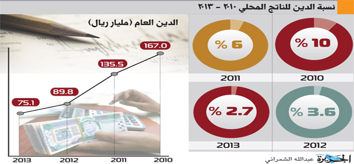 يتوقع أن ينخفض حجم الدين العام بنهاية العام المالي الحالي 1434 - 1435هـ (2013) إلى حوالي 75.1 مليار ريال ويمثل أقل من 2.7 بالمئة من الناتج المحلي الإجمالي المتوقع لعام 1434 - 1435هـ (2013) مقارنة بمبلغ 98.8 مليار ريال بنهاية العام المالي الماضي 1433 - 1434هـ (2013).