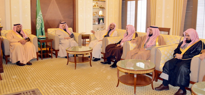 استقبل صاحب السمو الملكي الأمير فيصل بن بندر بن عبدالعزيز، أمير منطقة القصيم ظهر أمس الاثنين في مكتب سموه بمقر ديوان الإمارة في مدينة بريدة بحضور سمو نائبه صاحب السمو الملكي الأمير الدكتور فيصل بن مشعل بن سعود بن عبدالعزيز، معالي الرئيس العام لهيئة الأمر بالمعروف والنهي عن المنكر الشيخ الدكتور عبداللطيف آل الشيخ، والوفد المرافق له الذي يزور منطقة القصيم حالياً لحضور حفل تدشين دورات الأمر بالمعروف والنهي عن المنكر في تعزيز الأمن الفكري، الذي أقيم بمدينة بريدة مساء الأحد الماضي برعاية سمو أمير منطقة القصيم.