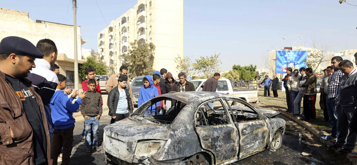 - مجموعة من الليبيين يشاهدون إحدى السيارات المتفجرة جراء زراعة قنبلة ملغومة فيها مما أصاب سائقها بجروح خطيرة ... رويترز