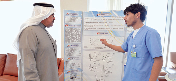 واستمع الدكتور يوسف العيسى بحضور عميد شؤون الطلاب، وكيل عميد شؤون الطلاب، وعميد كلية العلوم والمهن الصحية، ورئيس قسم العلوم الإنسانية بكلية العلوم والمهن الصحية، العميد المشارك للأنشطة الثقافية لعمادة شؤون الطلاب، إلى شرح مختصر من الطالب سليمان التويجري عن بحثه العلمي وبداية الفكرة وكيف تطورها حتى بات بحثا علميا.
