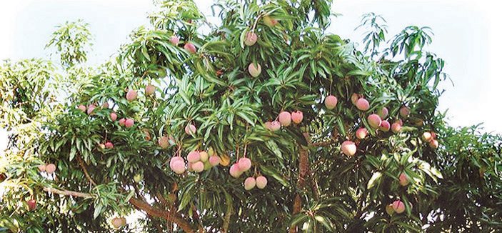 تشتهر المنطقة بزراعة أشجار المانجو وإنتاجها الغزير أكثر من غيرها من الأنواع والأصناف والمنتجات الزراعية الأخرى التي يتم زراعتها بالمنطقة ,حيث تعد شجرة المانجو التي قد يصل عمر البعض منها إلى 100 عام من أبرز الفواكه الاستوائية التي نجحت زراعتها بمنطقة جازان، ومن العوامل المساعدة لنجاح زراعة المانجو الأرض الزراعية المناسبة، حيث تعد الأراضي الصفراء الخفيفة أو الطميية العميقة جيدة الصرف ومعتدلة الحموضة والأراضي الحصوية المكان المناسبة لزراعة المانجو مع توفر الأجواء ذات الحرارة العالية نسبياً حيث تنمو أشجار المانجو بحالة جيدة عند توافر الرطوبة الجوية والأرضية، وتتنوع أصناف المانجو في المنطقة ومن أهمها (التومي والجل الجلين والزبدة وأبو سناره والكنت والكيت والبلمر والسنسيشن)، وحقق المانجو الجازاني بفضل بيئة المنطقة الزراعية المناسبة سمعة تجارية ليس على مستوى المملكة فحسب بل وحتى على المستوى العالمي؛ حيث وصل منتج المنطقة من المانجو للدول الأوروبية وعدد من الدول الأمريكية واليابان وغيرها من الدول، ويقام له في المنطقة مهرجان سنوي يحظى باهتمام المتابعين على مستوى المملكة، كما تنتج جازان العديد من أنواع الفواكه شبه الاستوائية مثل (التين والجوافة والموز والأناناس والباباي) إلى جانب العديد من أنواع الخضراوات كالطماطم والخيار والبطيخ والشمام والبن.