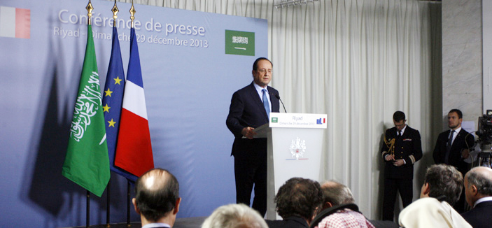 وفيما يتعلق بمصر أبان الرئيس الفرنسي قائلاً: نود وهذا موقف فرنسا أن يكون هناك انتقال سياسي للسلطة من خلال الانتخابات، ونأمل ذلك في وقت قريب، أما العلاقة بين البلدين فإننا نلحظ علاقات جيدة.. ملحوظة مؤخراً.. وأوضح أن المملكة العربية السعودية تعتبر أقوى شريك لفرنسا في الشرق الأوسط وان التبادل التجاري مع المملكة في عام 2013 بلغ 8 مليار يورو.. فرنسا هي المستثمر الأجنبي الثالث في المملكة.