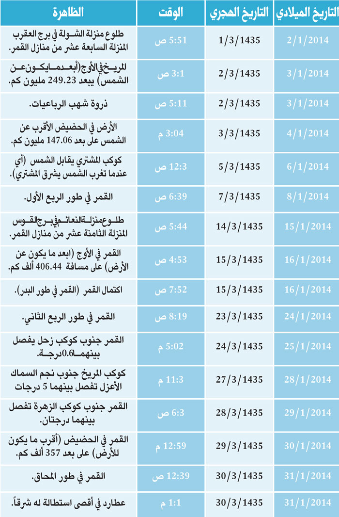 في يوم الخميس 15 من ربيع الأول الموافق 16 يناير: يكتمل بدر شهر ربيع الأول لعام 1435هـ. عند الساعة السابعة و52 دقيقة صباحاً، حيث يكون قرص القمر المواجه للأرض مضاءً بأكمله ويشرق القمر في مدينة الرياض عند الساعة الخامسة 50 دقيقة مساء أي بعد غروب الشمس بحوالي 24 دقيقة.