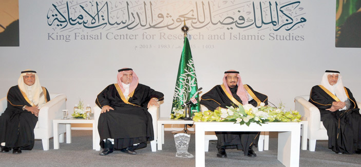 نيابة عن خادم الحرمين الشريفين الملك عبدالله بن عبدالعزيز آل سعود، رعى صاحب السمو الملكي الأمير سلمان بن عبدالعزيز آل سعود ولي العهد نائب رئيس مجلس الوزراء وزير الدفاع، مساء أمس، احتفال مركز الملك فيصل للبحوث والدراسات الإسلامية بمناسبة مرور ثلاثين عاما على تأسيسه، ولدى وصول سمو ولي العهد إلى مركز الفيصلية بالرياض، يرافقه صاحب السمو الملكي الأمير بندر بن سلمان بن عبدالعزيز، كان في استقبال سموه صاحب السمو الملكي الأمير محمد الفيصل رئيس مجلس أمناء مؤسسة الملك فيصل الخيرية، وصاحب السمو الملكي الأمير خالد الفيصل وزير التربية والتعليم مدير عام مؤسسة الملك فيصل الخيرية، وصاحب السمو الأمير خالد بن فهد بن خالد نائب رئيس مجلس إدارة مركز الملك فيصل للبحوث والدراسات الإسلامية، وصاحب السمو الملكي الأمير تركي الفيصل رئيس مجلس إدارة مركز الملك فيصل للبحوث والدراسات الإسلامية، وصاحب السمو الملكي الأمير خالد بن بندر بن عبدالعزيز أمير منطقة الرياض، وصاحب السمو الملكي الأمير تركي بن عبدالله بن عبدالعزيز نائب أمير منطقة الرياض.