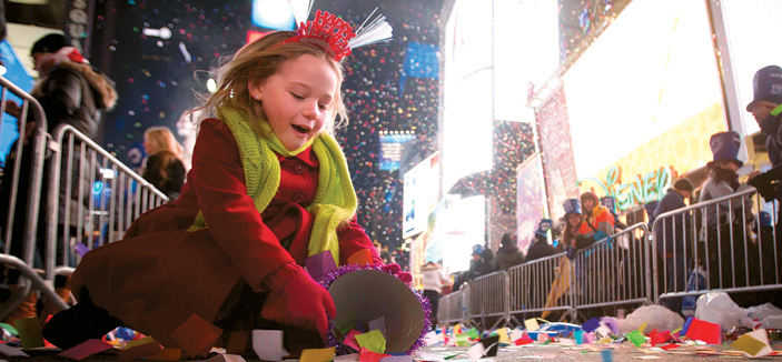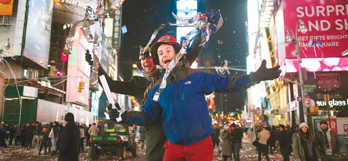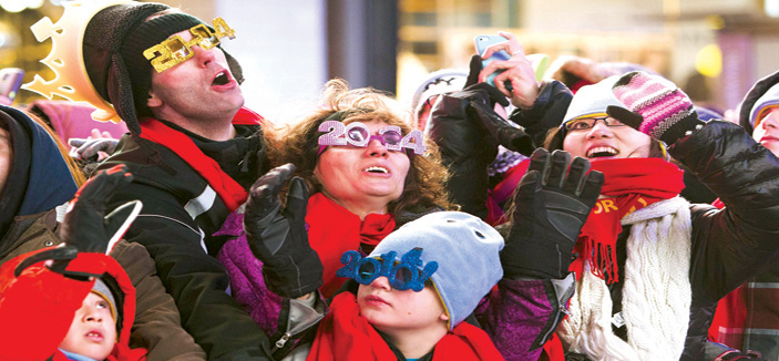 أقام المحتفلون بالعام الجديد من سيدني إلى دبي عروضا باذخة بالألعاب النارية في حين استقبلت لندن عام 2014 برش رذاذ بنكهة الفواكه ونظمت الولايات المتحدة احتفالات ضخمة في الهواء الطلق. ففي نيويورك تحدت الحشود البرودة القارسة ولوحت بالبالونات ودقت الأجراس وسط إجراءات أمن مشددة في ساحة تايمز سكوير للمشاركة حفل بداية العام الجديد الذي يقام سنويا. واستمع الحاضرون لغناء مايلي سايروس وميليسا إثريدج قبل أن يشاهدوا نزول كرة ضخمة مغطاة بالكريستال لحظة بداية عام 2014 وصدحت الموسيقى وغطى بحر من الحلوى وسط مانهاتن.