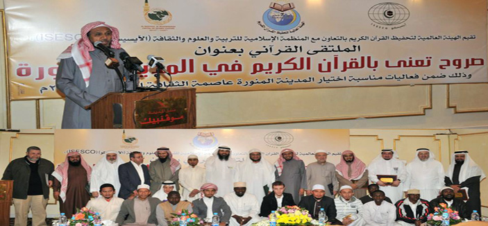 اختتمت فعاليات الملتقى القرآني «صروح تعنى بالقرآن الكريم» بالمدينة المنورة، والذي أقامته الهيئة العالمية لتحفيظ القرآن الكريم، بالتعاون مع المنظمة الإسلامية للتربية والعلوم والثقافة (الآيسيسكو) تحت رعاية الأمير فيصل بن سلمان، أمير المنطقة، وذلك بعد خمس جلسات متنوعة وورش عمل وخرج الملتقى بعدد من التوصيات منها، العمل على تشييد قسم باللجنة الفرعية للهيئة بالمدينة المنورة، والسعي لإقامة أكاديمية أو قسم جامعي أو دبلوم لإعداد وتدريب الكفاءات لإدارة المعاهد والحلقات القرآنية علميا وتربويا، والاهتمام بإقامة معرض دولي متنقل يهتم بإظهار تاريخ نزول القرآن الكريم وكتابته وتعليمه عبر العصور، بالتعاون مع مجمع الملك فهد لطباعة المصحف الشريف، وكذلك إقامة مؤتمرات قرآنية في مختلف دول أوربا للتعريف بفضل القرآن الكريم وأهله وتعظيمه والدفاع عنه.