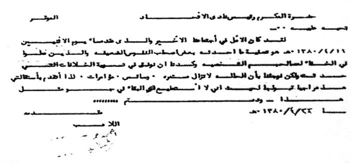 ضوئية تاريخية مرفوعة في 23ـ4ـ1380هـ من لاعب الاتحاد السابق أحمد عمر مسعود إلى رئيس نادي الاتحاد آنذاك الشيخ عبداللطيف لنجاوي -رحمه الله- تتضن طلبه بالموافقة على ترك الفريق احتجاجاً على بعض التصرفات (..)!!