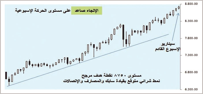- نمط شرائي مرجح قاعه 8660 نقطة وقمته عند 8750 نقطة للمؤشر العام.