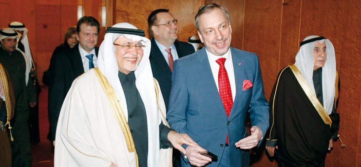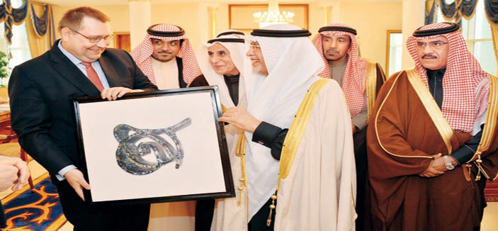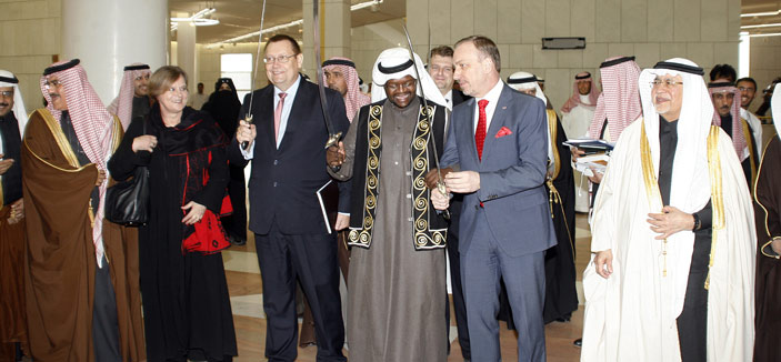 عقد معالي وزير الثقافة والإعلام الدكتور عبدالعزيز بن محيي الدين خوجة في مكتبه بمركز الملك فهد الثقافي أمس اجتماعا مع معالي وزير الثقافة والتراث الوطني بجمهورية بولندا بوجدان ردرويفسكي. وجرى خلال الاجتماع بحث سبل تعزيز التعاون بين البلدين في المجالات الثقافية. حضر الاجتماع معالي نائب وزير الثقافة والإعلام الدكتور عبدالله الجاسر ومعالي رئيس هيئة الإذاعة والتلفزيون الأستاذ عبدالرحمن الهزاع ومعالي رئيس وكالة الأنباء السعودية الأستاذ عبدالله بن فهد الحسين ومعالي رئيس الهيئة العامة للإعلام المرئي والمسموع الدكتور رياض نجم ووكيل وزارة الثقافة والإعلام للشؤون الثقافية الدكتور ناصر بن صالح الحجيلان، ووكيل الوزارة للعلاقات الثقافية الدولية الدكتور عبدالعزيز بن سلطان الملحم، ووكيل الوزارة للإعلام الداخلي الدكتور عبدالعزيز العقيل. كما حضره الوفد المرافق لمعالي وزير الثقافة والتراث الوطني البولندي, وسفير بولندا لدى المملكة فيتولد شميدوفسكي. وقد تجوّل معاليه مع الوزير البولندي والوفد المرافق في قاعات وأجنحة المركز واطلعوا على فيلم يستعرض المسيرة التنموية للمملكة، وعلى القبة الفلكية، وبعض المرافق المهمة بالمركز. ثم شارك معالي وزير الثقافة والإعلام ومعالي وزير الثقافة والتراث الوطني البولندي في العرضة السعودية. بعد ذلك تناول الجميع طعام الغداء المقام بهذه المناسبة.