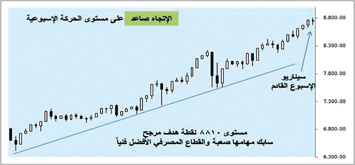 المؤشر العام يستهدف الأسبوع المقبل قمة جديدة عند مستوى 8810 نقاط، وإغلاق عند 8750 نقطة، أي بنمط بيعي، لكن يتوقع أن يخفف من حدة البيع القطاع المصرفي، وخصوصاً بعد اختراق المقاومة 18050 نقطة للقطاع، وتسجيل قمة جديدة مدعومة بمحفزات أداء الموسم رغم سلبية قائده (الراجحي). أما فرس الرهان الآخر فهو قطاع الاتصالات بسبب الحالة الفنية وأداء فوق المتوقع لموبايلي والاتصالات السعودية وحاجزه النفسي الأخير.