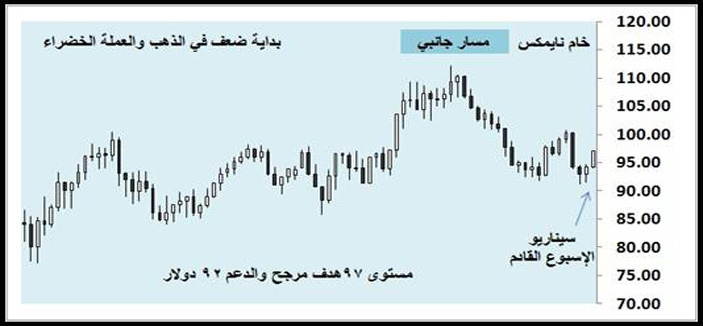 أكد خام نايمكس دعمه عند مستوى 92 دولاراً، وأنهى الأسبوع عند مستوى 94.16 دولار، وتمكَّن من تشكيل نمط شرائي متوسط القوة بعد أسبوعين من الهبوط. ويرجَّح الأسبوع المقبل أن يجرب نفسه عند مستوى 97 دولاراً، والإغلاق عند مستوى 96 دولاراً؛ بسبب ضعف الدولار عند مستوى 81 أمام سلة عملاته. وواضح جداً أن الذهب يكون قمة هابطة بين 1200 و1400 دولار للأونصة قبل كسر الحاجز النفسي ألف دولار للأونصة.