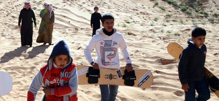 انطلقت بحائل فعالية رياضة التزلج على الرمال ضمن مهرجان الصحراء الدولي والذي قام تحت مظلة مجلس التنمية السياحية في المنطقة، وتقام فعالية التزلج على رمال نفود قناء شمال حائل 50 كيلو متراً ،وتعد منطقة حائل أول من ادخلت هذه الرياضة ضمن الأجندة السياحية الخاصة بالمنطقة. فيما استقطبت أعداداً كبيرة لممارستها في يومها الأول والتعرف على طريقة أدائها وقوانينها، وقام بممارستها أيضاً مقيمون من جنسيات مختلفة ،وسط حضور جماهيري لمراقبة ومتابعة هذه الفعالية الجديدة. من جهته ذكر لـ « الجزيرة» منظم الفعالية الكابتن غازي الشمري بأن الفعالية تم تجربتها العام الماضي ولقيت استحسانا وإقبالا جماهيريا من قبل زوار منطقة حائل، وهذا العام تم الاستعداد لها بشكل موسع ويوازي حجم الإقبال عليها ،فقد تم تحديد موقع الفعالية بعناية ،ليتمكن ممارس رياضة التزلج من قطع مسافة أطول على ظهر زلاجته، مع تدريب محبي هذه الرياضة على طريقة استخدام الزلاجات، وقوانين اللعبة. كما تم تأمين 15 زلاجة « ساند بورد» من أمريكا، مخصصة للتزلج على الرمال، خصيصا لهذه الفعالية.