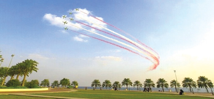 حوّلت طائرات الصقور الخضر سماء مدينة الخُبر إلى ساحة استعراض مثيرة وحركات بهلوانية وتشكيلات مبتكرة، في عرض انطلق أمس الأول الأحد، وشاهده عشرات الآلاف من الزوار، وذلك ضمن مهرجان الخبر السياحي، واستمر لمدة يومين. وقد استغرقت مدة العرض الواحدة نحو 25 دقيقة بست طائرات من نوع هوك، صبغت باللون الأخضر، متوافقة مع شعار السعودية، فيما تنوعت التشكيلات خلال العرض برسم شعار المملكة المكون من السيفين والنخلة، إضافة إلى الحلقة، والكماشة، والالتقاء المقلوب، والموجة، والزوبعة، والتتابع، والقلب والسهم، والاختراق، والنسر، والانفجار.