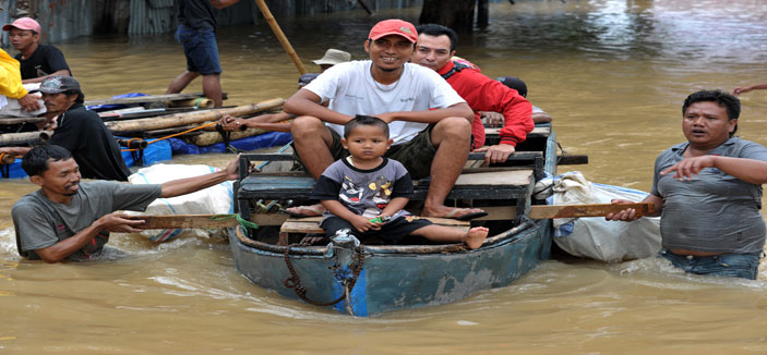 - مياه الفيضانات والأمطار تجبر سكان جاكارتا على ترك منازلهم بعد أن غطتها المياه، ويتنقلون بزوارق صغيرة في وسط جاكارتا ... أ ف ب