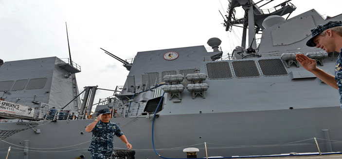 - يظهر في الصورة قائد أسطول البحرية الأمريكية في المحيط الهادي العميدِ هاري هاريس خلال زيارة قام بها للباخرة الأمريكيةِ (دي دي جي 111) مدمّرة الصواريخ التي أرستْ في ميناء سنغافورة ... أ ف ب