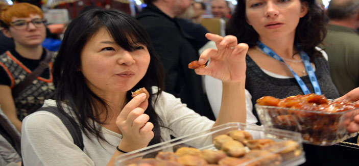 حظي قسم التمور في جناح المملكة العربية السعودية المشارك في المعرض الدولي الزراعي المقام حالياً في برلين أمس بتوافد أعداد كبيرة من الزوار من مختلف الجنسيات بسبب التميز في المعروض من التمور والأصناف الجديدة التي طرحتها الشركات الوطنية. وأكد الرئيس التنفيذي للمركز الوطني للنخيل والتمور المشرف على القسم فهد بن محمد العبد الكريم أن المركز حرص على توفير أصناف التمور السعودية المشهورة في جناح المملكة المشارك في المعرض الذي يحتل ثلث مساحته لتعريف الجمهور الأوروبي بها وبالتالي تسويقها في السوق الأوروبي ومنافسة الموجود فيها من الدول الأخرى وأخذ نصيب من هذه السوق. وقال إن: «المملكة اشتهرت بأصناف متميزة لا توجد في غيرها من بلاد العالم كتمور الخضري التي لاقت إقبالاً كبيراً من زوار المعرض ووجدنا أن الأوروبيين يفضلونه كثيراً لأنه قريب من المجدول ولونه داكن إضافة إلى الصقعي والسكري والفلة والمكنوز من الخلاص الذي بمجرد ما يتذوقه الزوار يطلبون الشراء منه فوراً». كما لفت إلى استعداد 15 شركة سعودية منتجة للتمور للمشاركة في معرض فروت لوجستيا في برلين من الخامس وحتى السابع من فبراير القادم بإشراف المركز الوطني للنخيل والتمور, حيث سيتم عرض التمور السعودية ومشتقاتها المتنوعة من جميع مناطق المملكة باعتبار أن هذه المشاركة تعد فرصة لعقد صفقات تخدم المنتجين وتزيد من صادراتهم للخارج وبالتالي زيادة المردود الإيجابي لاقتصاد المملكة.
