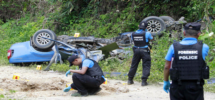 - رجالُ أمن تايلانديين يفحصون موقع حطامِ سيارة شرطة بعد تعرّضها لهجوم بواسطة قنبلة ... رويترز