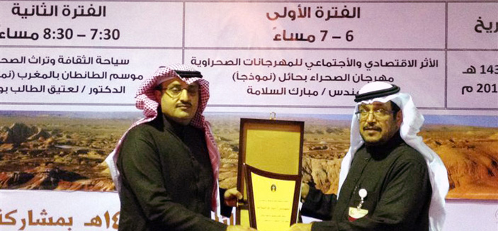 إلى ذلك تحدث المهندس مبارك السلامة، المدير التنفيذي لجهاز السياحة بمنطقة حائل، خلال ورشة العمل التي حملت عنوان «نحو سياحة صحراوية مستدامة» عن الأثر الاقتصادي لمهرجان الصحراء بمنطقة حائل، كما تحدث الدكتور الطالب بويا لعتيك ماء العينين، الخبير الأكاديمي في التراث الحساني في المملكة المغربية، عن السياحة الثقافية بالجهات الجنوبية المغربية «موسم طنطان» نموذجاً.