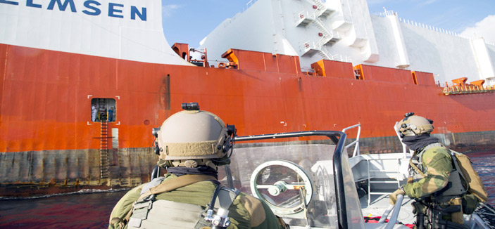 - سفينة نرويجية تقف بأحد الموانئ، حيث إن هذه السفينة من السفن المكلّفة بنقل المواد الكيماوية التي يمتلكها النظام السوري فيما وضع عليها حراسة مشدَّدة لحمايتها من أي اعتداء.