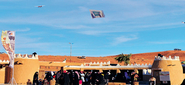 علت الأصوات تشجيعاً وترحيباً لأكبر علم سعودي توسط كبد السماء فى مهرجان الغضا بعنيزة .. وبدافع الشعور الفطري بحب الوطن أرسل الأطفال قبلاتهم إلى السماء معبرين عن اعتزازهم بالعلم السعودي وحب المليك والوطن.
