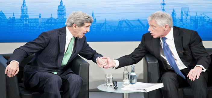 - وزير الخارجية الأمريكي جون كيري يتحدث مع وزير الدفاع الأمريكي تشوك هيجل في مؤتمر ميونخ للأمن والسلام, الذي عقد في جنوب ألمانيا ويناقش القضايا المهمة الظاهرة على الساحة الدولية، ويحضر هذا المؤتمر عدد من القادة السياسين والعسكرين ... أ ف ب