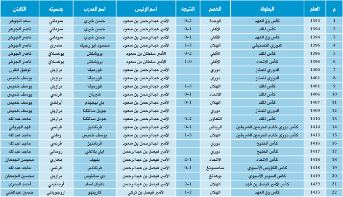 وتعتبر فترة رئاسة الأمير عبدالرحمن بن سعود -رحمه الله- أكثر الفترات التي حقق الفريق فيها بطولات حيث حقق الفريق 13 بطولة محلية وبطولة خليجية، كما حقق الفريق في فترة رئاسة الأمير سلطان بن سعود بطولتين محليتين، وواصل الرئيس الذهبي للفريق الأمير فيصل بن عبدالرحمن تحقيق البطولات بواقع 5 بطولات، منها بطولتين آسيويتين و3 بطولات محلية.