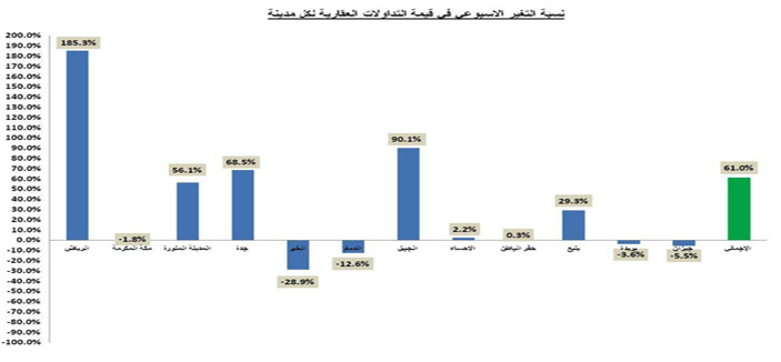 بنسبة 185.3 % ارتفاع تصدرت السيولة العقارية في مدينة الرياض الارتفاعات العقارية في المملكة لتصل إلى 3.6 مليار ريال الأسبوع الماضي استحوذ القطاع السكني على 64% منها، وبلغت قيمة أكبر الصفقات العقارية بالرياض بقيمة 787 مليون ريال تم من خلالها شراء أرض خام مساحتها 500 ألف متر، كما سجلت المؤشرات العقارية الأخرى ارتفاعا وبنسبة 59.5% لحجم المساحة المتداولة و 17.6% لمؤشر الصفقات.