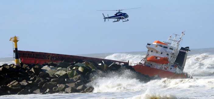 - أفراد طاقم إسباني يحاول إنقاذ سفينة الشحن ‹Luno› المحملة بالديزل والتي تحطمت قرب شاطئ Anglet