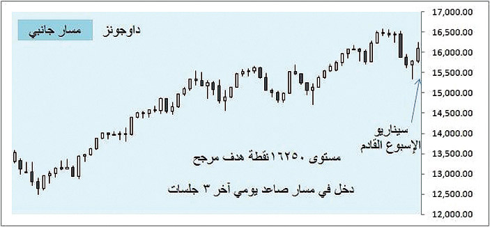 أنهى مؤشر الداوجونز الأسبوع السادس على التوالي بنمط بيعي ومسار هابط وصلت ذروته 15340 نقطة بسبب مؤشرات سلبية للاقتصاد الأمريكي، أرغمت شهية المخاطرة على الانخفاض؛ ما مكَّن الذهب والدولار من تحقيق مكاسب متواضعة، لكن مع آخر ثلاث جلسات للأسبوع الماضي بدأ المسار الصاعد، وتم تقليص الخسائر إلى مستوى 15794 نقطة، ويُتوقَّع الأسبوع المقبل إكمال الارتداد إلى مستوى 16250 نقطة بسبب سوق العمل.