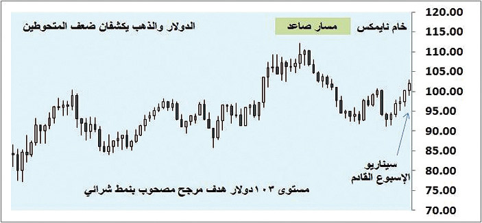 خامات النفط طيلة الأسبوع في صعود للعقود الآجلة للأشهر الثلاثة القادمة، وتراجع شهية المخاطرة في الأسواق المالية لم يفلح في دفع المتحوطين لشراء الذهب والدولار بقوة رغم المؤشرات السلبية للاقتصاد الأمريكي، لكنها كشفت عن قمة رائعة لنايمكس عند 100.24 دولار للبرميل، وإنهاء الأسبوع بنمط شرائي قوي، وعودة للتداول فوق الحاجز المئوي ضمن المسار الصاعد. ويتوقع تسجيل قمة أخرى عند مستوى 103 دولارات الأسبوع المقبل.