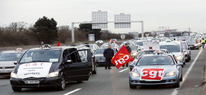 - مجموعة من أصحاب سيارات الأجرة الفرنسية يقفون الطريق المؤدي إلى مطار شارل ديغول وذلك للاحتجاج على إنشاء القطارات السريعة التي من المحتمل أن تؤثر على سير عملهم... أ ف ب