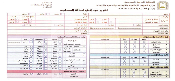 وقد تضمنت الاستمارة التي عنونت بـ(تقرير ميداني لحالة المسجد) مجموعة من الحقول والخانات منها (اسم المسجد ورقمه وفئته ومحيطه، وشوارعه، وإحداثياته، وحالته العمرانية، وحالة الكهرباء، وأوضاع دورات المياه وحالها، والتأثيث والتجهيزات المختلفة.