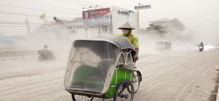 - مواطن إندونيسي يلبس قناعاً ليتفادى الرماد الناتج من انفجار أحد الجبال البركانية في إقليم جاوه الإندونيسي. (رويترز)