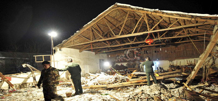 - عمال إنقاذ يفتشون في الحطام وسط تساقط الثلوج بعد أن انهارت الصالة القديمة أثناء مراسم زفاف في إحدى المقاطعات الصينية. (رويترز)