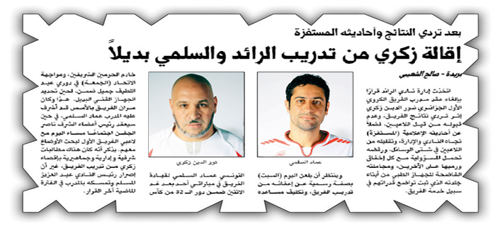 أعلنت إدارة الرائد بصفة رسمية عن إقالة الجزائري نور الدين زكري من تدريب الفريق الكروي الأول وتكليف مساعده التونسي عماد السلمي، وهو ما أشارت إليه الجزيرة أمس الأول، حيث شرع السلمي في مهامه التدريبية وستكون مواجهة اليوم (الاثنين) أمام فريق أحد ضمن دور الـ 32 من مسابقة كأس خادم الحرمين الشريفين أولى مهامه الرسمية مع الفريق، وجاء إبعاد زكري من تدريب الفريق بتوجه جماعي من لاعبي الفريق الذين كاشفوا الإدارة وأعضاء الشرف برغبتهم في إبعاده وعدم ارتياحهم له.