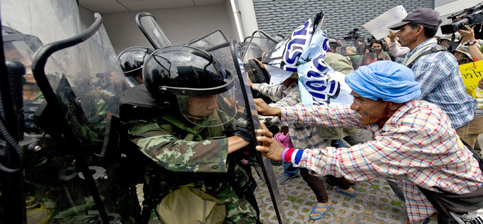 - تواصل الاشتباكات والمظاهرات بين محتجين وعناصر من الأمن التايلاندي مطالبين برحيل الحكومة الحالية ورئيسة الوزراء، وتشكيل مجلس شعبي يحكم البلاد... أ ف ب