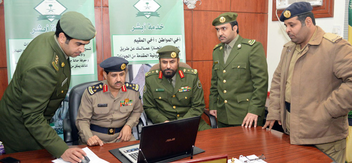 حيث استقبل مدير الدفاع المدني بالقصيم العميد الدكتور علي العتيبي، مساعد مدير جوازات القصيم لشؤون العمليات العقيد سليمان السليمان، والرائد تركي بن جامع، والنقيب خالد الرشيدي، حيث استمع لشرح عن الخدمة من فريق أبشر وما تتضمنه من خدمات تساعد المواطن والمقيم لإنهاء إجراءاته من أي مكان .