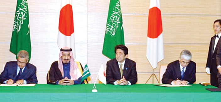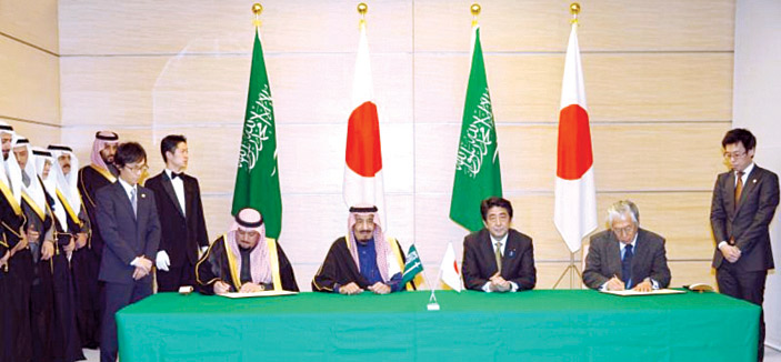 حضر صاحب السمو الملكي الأمير سلمان بن عبدالعزيز آل سعود ولي العهد نائب رئيس مجلس الوزراء وزير الدفاع ودولة السيد شينزو آبي رئيس وزراء اليابان ، بديوان مجلس الوزراء الياباني في طوكيو أمس مراسم توقيع ثلاث اتفاقيات: الأولى مذكرة تفاهم في التعاون بين هيئة الاستثمار السعودية (SAGIA) ومركز التعاون الياباني للشرق الأوسط (JCCME) فيما يتعلق بتطوير التعاون في مجال الاستثمار المشترك وقعها من الجانب السعودي معالي محافظ الهيئة العامة للاستثمار المهندس عبداللطيف العثمان ومن الجانب الياباني رئيس مركز التعاون الياباني للشرق الأوسط (JCCME) أوكودا.