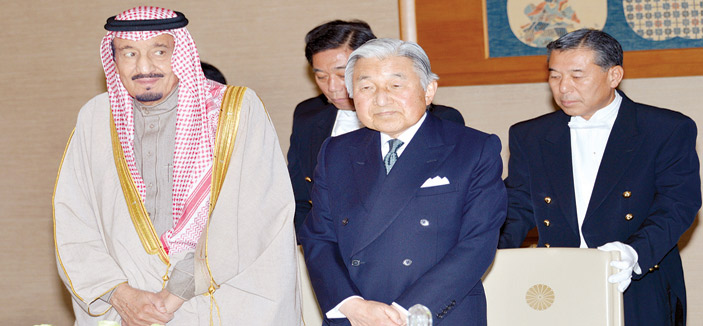 أقام جلالة الإمبراطور أكهيتو إمبراطور اليابان حفل غداء ظهر أمس تكريماً لصاحب السمو الملكي الأمير سلمان بن عبدالعزيز آل سعود ولي العهد نائب رئيس مجلس الوزراء وزير الدفاع -حفظه الله-, بحضور صاحب السمو الملكي الأمير ناروهيتو ولي عهد اليابان. حضر حفل الغداء صاحب السمو الملكي الأمير محمد بن سلمان بن عبدالعزيز رئيس ديوان سمو ولي العهد المستشار الخاص لسموه ومعالي وزير الدولة عضو مجلس الوزراء الدكتور مساعد بن محمد العيبان ومعالي وزير الثقافة والإعلام الدكتور عبدالعزيز بن محيي الدين خوجة ومعالي وزير الاقتصاد والتخطيط الدكتور محمد بن سليمان الجاسر ومعالي وزير التجارة والصناعة الدكتور توفيق بن فوزان الربيعة ومعالي وزير الدولة للشؤون الخارجية الدكتور نزار بن عبيد مدني ومعالي نائب رئيس هيئة الأركان العامة الفريق ركن عبدالرحمن بن صالح البنيان، فيما حضره من الجانب الياباني دولة رئيس الوزراء شينزو آبي ومعالي وزير الخارجية فوميو كيشيدا وعدد من كبار المسؤولين في الحكومة اليابانية.