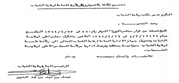 * في عام 1394هـ وافق الملك فيصل - طيّب الله ثراه - على مشروع إنشاء مجلس أعلى لرعاية الشباب .. وتعيين الأمير الراحل فيصل بن فهد - رحمه الله - رئيساً عاماً لرعاية الشباب، واستقلالها مالياً وإدارياً من وزارة العمل والشئون الاجتماعية، بعد أن كانت تحت مظلّتها منذ أوائل حقبة الثمانينيات الهجرية.. وفي الوثيقة المنشورة .. تتضمّن تعميماً لكافة مكاتب وفروع الرئاسة .. بقرار مجلس الوزراء الموقر.. القاضي بتحويل جهاز الإدارة العامة لرعاية الشباب إلى رئاسة عامة بميزانية مستقلة وترتبط إدارياً برئاسة المجلس الأعلى لرعاية الشباب.