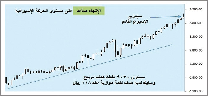 هذا الأسبوع سيكون الحاجز النفسي 9000 نقطة مؤشراً لشهية المخاطرة في السوق وفنياً المؤشرات تشير إلى أن سابك لديها فرصة قوية للارتفاع إلى مستوى 118 ريالاً وعودة القطاع المصرفي لحاجز 19000 نقطة ودعم متوقع للقطاع العقاري إلى 5830 نقطة، وهذا المؤشرات كافية لدفع السوق إلى مستوى 9150 نقطة، لكن يرجح أن يكون هناك جني أرباح سريع وإغلاق قريب من مستوى 9050 نقطة وهي مستويات تاريخية وحساسة.
