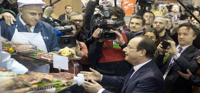 - الرئيس الفرنسي فرانسوا أولاند يتناول قطعاً من اللحم خلال زيارته لمعرض باريس الدولي الزراعي ... أ ف ب