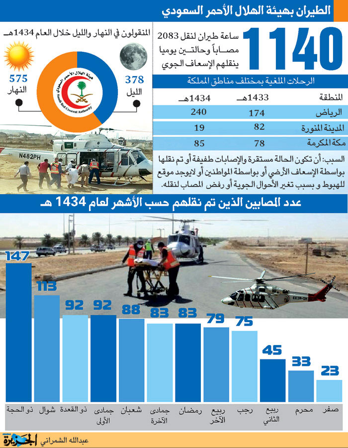 كما بيّن الاحصائيات كذلك عدد المنقولين في النهار والليل خلال العام 1434هـ حيث بلغ عدد المصابين الذين تَمَّ نقلهم بواسطة الإسعاف الجوي في النهار (575) مصاب اما في اللَّيل فقد بلغ العدد (378) مصابًا.