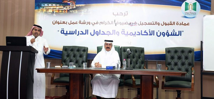 افتتح عميد عمادة القبول والتسجيل بجامعة تبوك الدكتور سعيد الغامدي ورشة عمل بعنوان (الشؤون الأكاديمية والجدول الدراسي ) وركزت أعمال الورشة على ثلاثة محاور هي( إعداد الجدول الدراسي للكليات ضمن المعايير والضوابط الأكاديمية) و(الشؤون الأكاديمية) و(نظام الشؤون الأكاديمية والإرشاد الأكاديمي).