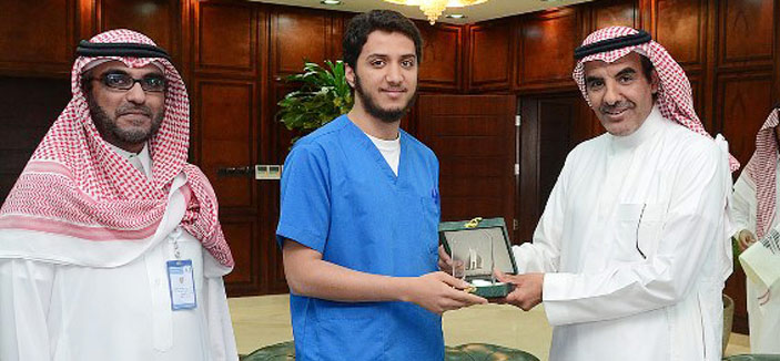 كرم معالي مدير جامعة سلمان بن عبدالعزيز الدكتور عبدالرحمن بن محمد العاصمي، الطلاب المشاركين من كلية طب الأسنان الحاصلين على المركز الثاني في المؤتمر العلمي السادس.