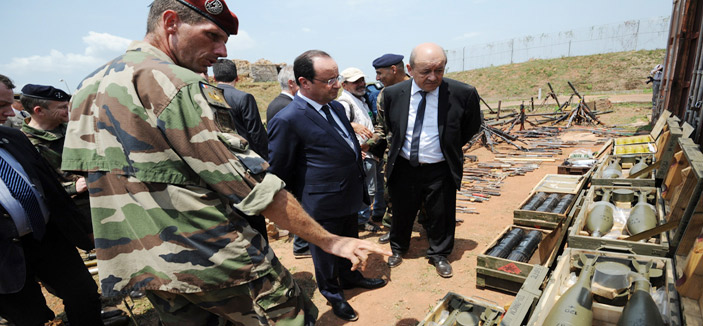 - الرئيس الفرنسي فرانسوا أولاند بجانب وزير الدفاع الفرنسي جين إيفس لو في قاعدة عسكرية فرنسية في بانجوي، ينظرون إلى الأسلحة التي صودرت من المحتجين والمعارضين في جمهورية إفريقيا الوسطى .. (أ ف ب)