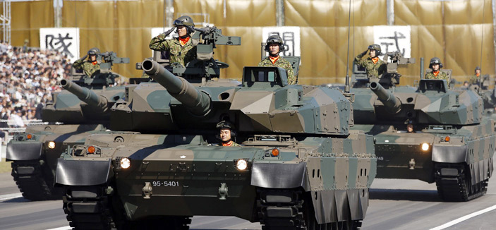 - أعضاء من فرقة دبابة لقوات الدفاع عن النفس في اليابان تشترك مع دبابات مدرعة أثناء الاستعراض العسكري في مراسم القوات العسكرية السنوية في قاعدة اسكا قرب طوكيو... (رويترز)