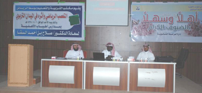 والندوة شارك فيها الأستاذ المشارك بكلية علوم الرياضة والنشاط البدني د. صلاح بن أحمد السقا ومدير مكتب التربية والتَّعليم بالوسط د. خالد بن عبدالرحمن الرشيد ومشرف الإدارة المدرسية صالح التويجري ومشرفي التربية البدنية خالد السعد وعبد الله الشبيلي، وبحضور أكثر من 120 من مديري المدارس ومعلمي التربية البدنية.