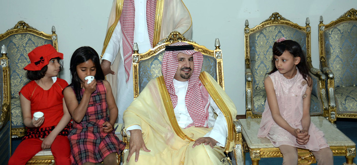 وفور وصول سموه لصالة الاستقبال قام بمعانقة أبنائه وبناته من أيتام الجمعية وبادلهم الكلمات الأبوية, مداعباً سموه براءة الطفولة التي يحملونها في قلوبهم.